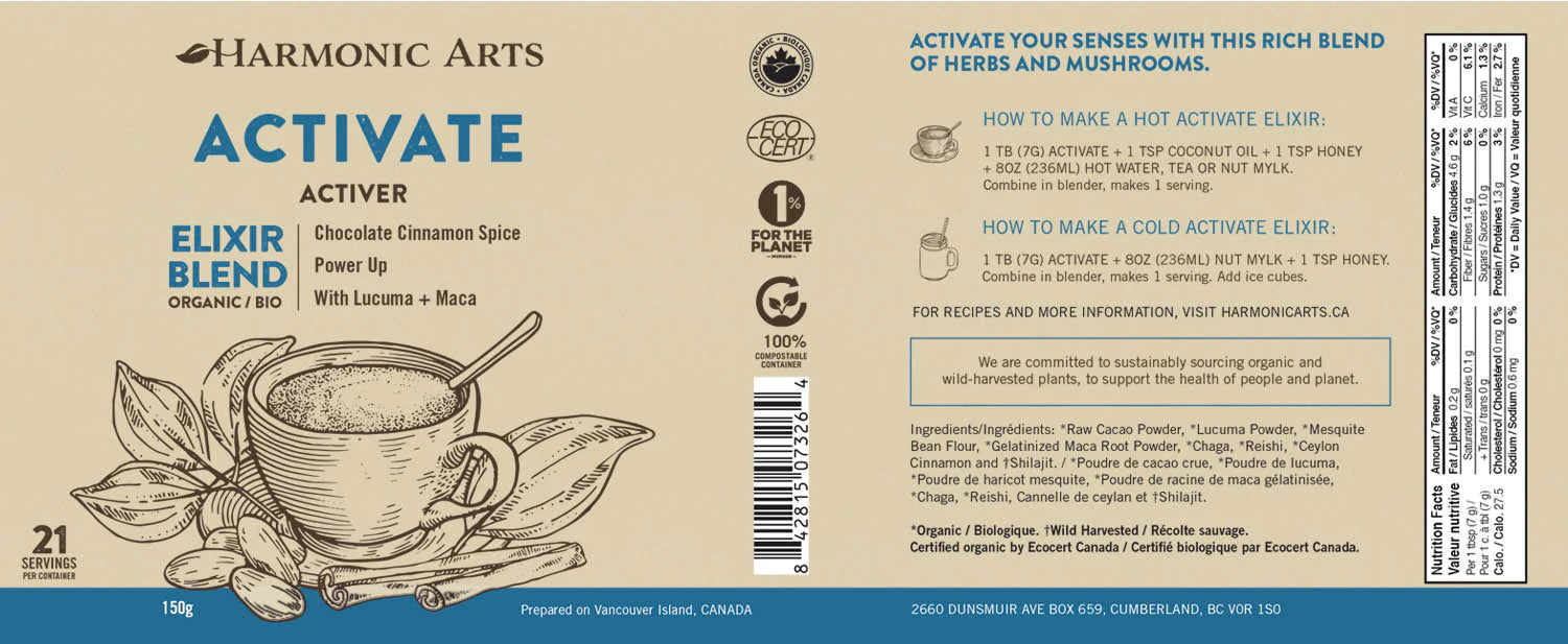 Power up for the day ahead with our energizing Activate Elixir. Rich in flavour and antioxidants, this smooth blend features Reishi, Chaga, Cacao, Lucuma and Maca. Ignite your senses while staying grounded with these nourishing herbs and mushrooms.