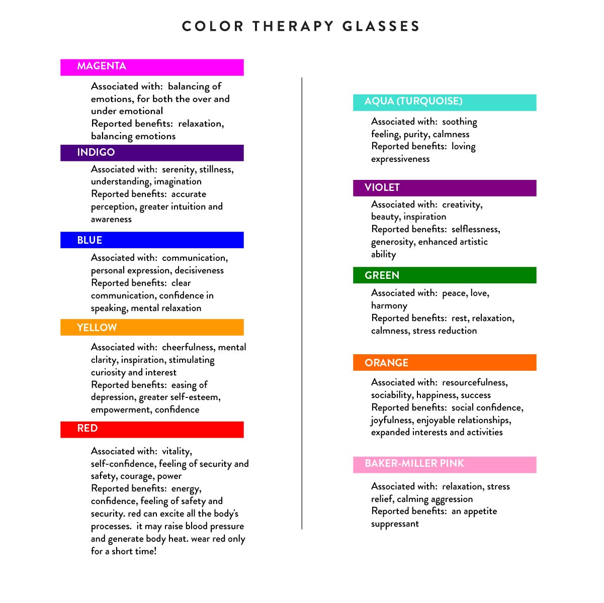 Each colour has a different effect. The effects of colour on mood has been studied for decades and these glasses make it easy to see the world through rose coloured glasses. Literally.
